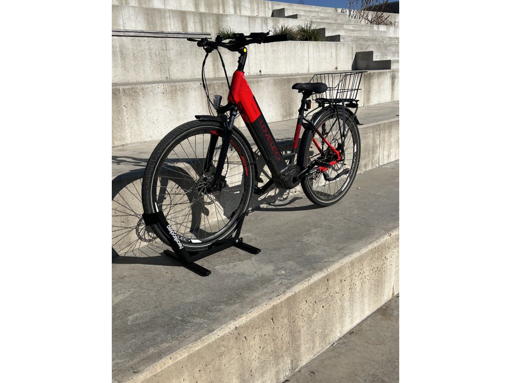 The advantage of this solution is that the weight of the bike presses down on the lever, which pulls the tires together. This prevents deformation of the rim and ensures high stability of the bike during maintenance, charging, or servicing.